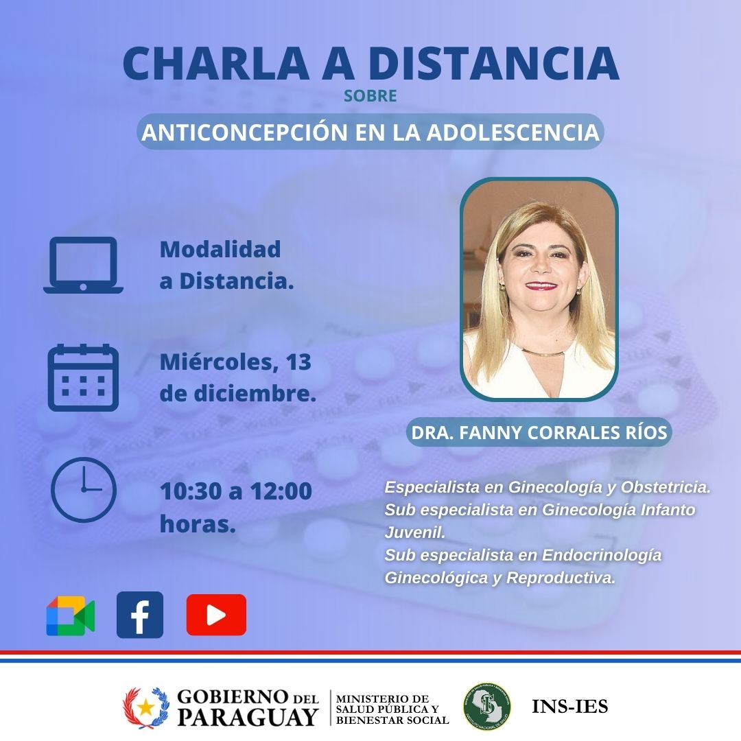 El Instituto Nacional de salud invita a todos los interesados a participar de la charla a distancia, sobre “Anticoncepción en la Adolescencia” a realizarse con la modalidad a distancia, el miércoles 13 de diciembre de 10:13 a 12:00 horas.