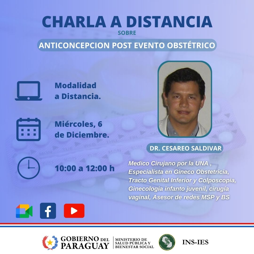 El Instituto Nacional de salud invita a todos los interesados a participar de la charla a distancia, sobre “Anticoncepción Post evento obstétrico” a realizarse con la modalidad a distancia, el miércoles 6 de diciembre de 10:00 a 12:00 horas.
