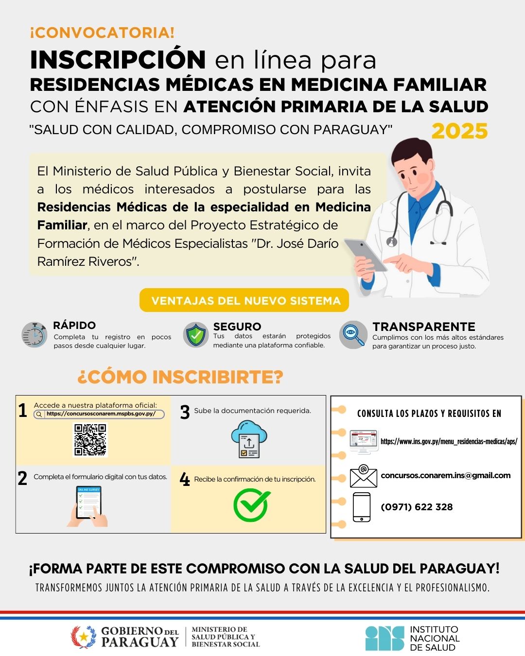 El Ministerio de Salud Pública y Bienestar Social, invita a los médicos interesados a postularse para las Residencias Médicas de la especialidad en Medicina Familiar, en el marco del Proyecto Estratégico de Formación de Médicos Especialistas «Dr. José Darío Ramírez Riveros».