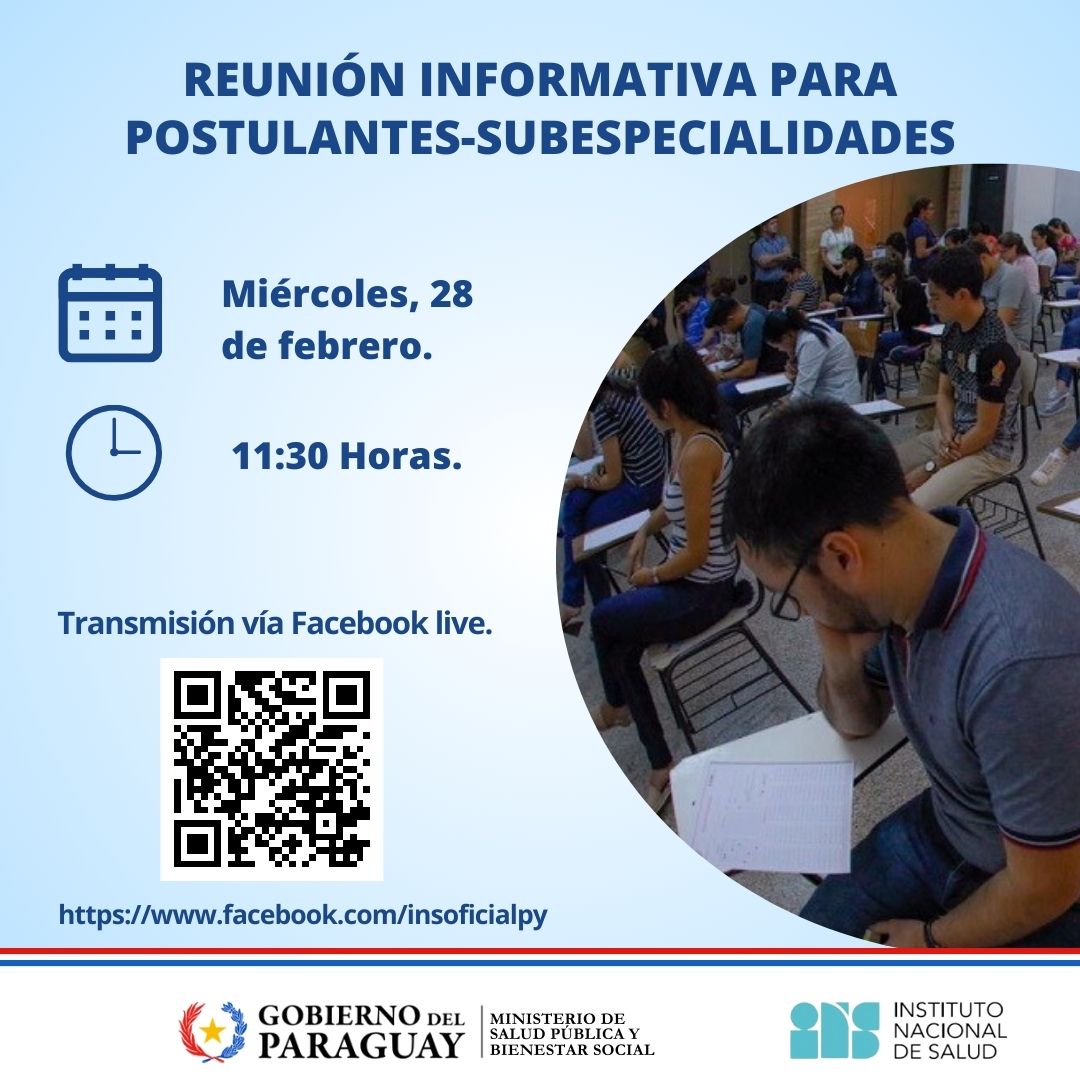 Este miércoles, 28 de febrero a las 11:30 horas, se llevará a cabo una reunión informativa para Postulantes-Subespecialidades. La actividad será transmitida en la cuenta oficial del Instituto Nacional de Salud a través de Facebook Live.