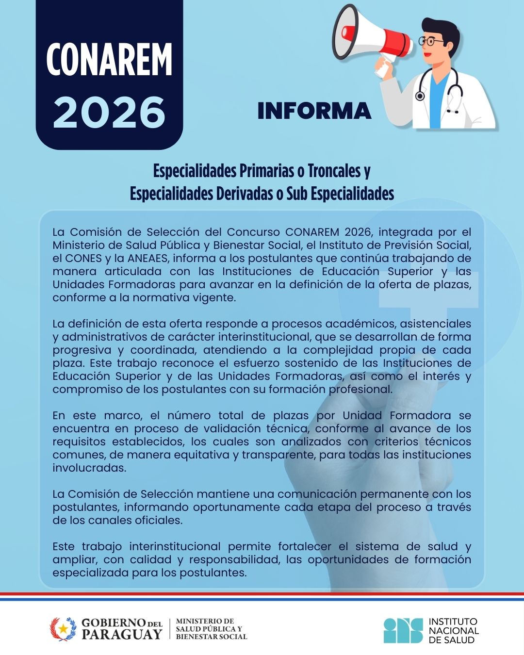 La Comisión de Selección del Concurso CONAREM 2026, integrada por el Ministerio de Salud Pública y Bienestar Social, el Instituto de Previsión Social, el CONES y la ANEAES, informa a los postulantes que continúa trabajando de manera articulada con las Instituciones de Educación Superior y las Unidades Formadoras para avanzar en la definición de la oferta de plazas, conforme a la normativa vigente.