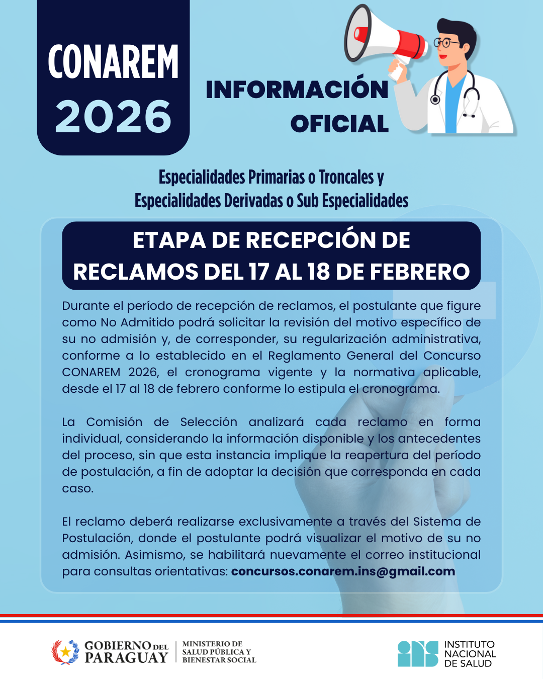 El reclamo deberá realizarse exclusivamente a través del Sistema de Postulación, donde el postulante podrá visualizar el motivo de su no admisión. Asimismo, se habilitará nuevamente el correo institucional para consultas orientativas: concursos.conarem.ins@gmail.com