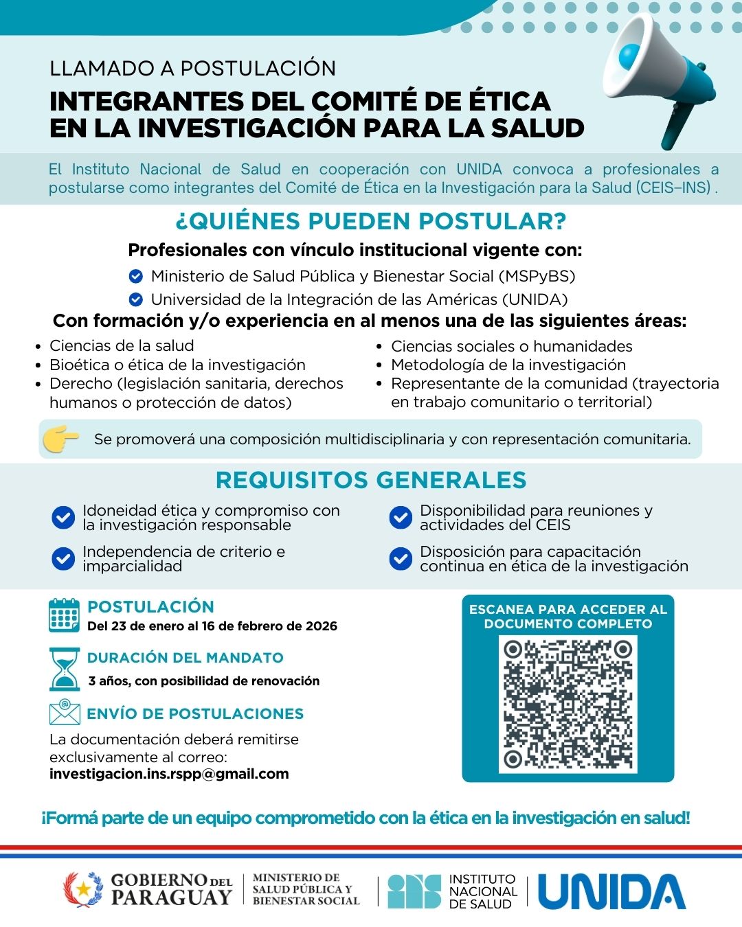 La convocatoria está dirigida a profesionales con vínculo institucional vigente con el Ministerio de Salud Pública y Bienestar Social (MSPyBS) o con la UNIDA, con formación y experiencia en áreas vinculadas a las ciencias de la salud, bioética o ética de la investigación, derecho, ciencias sociales o humanidades, metodología de la investigación.