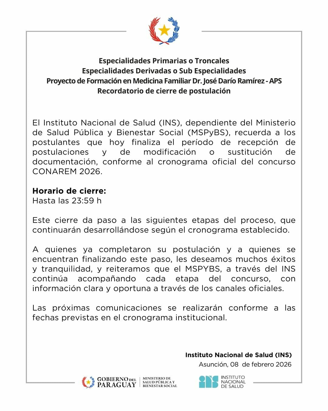 El Instituto Nacional de Salud (INS), dependiente del Ministerio de Salud Pública y Bienestar Social (MSPyBS), recuerda a los postulantes que hoy finaliza el período de recepción de postulaciones y de modificación o sustitución de documentación, conforme al cronograma oficial del concurso CONAREM 2026.