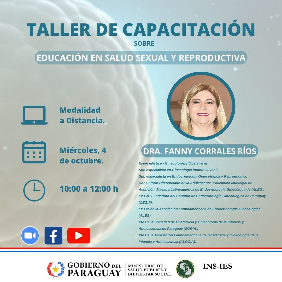 El evento estará a cargo de la Dra. Fanny Corrales Ríos, Especialista en Ginecología y Obstetricia. Sub especialista en Ginecología Infanto Juvenil. Sub especialista en Endocrinología Ginecológica y Reproductiva. Consultorio Diferenciado del Adolescente. Policlínico Municipal de Asunción. Maestra Latinoamericana de Endocrinología Ginecología de (ALEG). Ex Pct. Fundadora del Capítulo de Endocrinología Ginecológica de Paraguay (CEGIP). Ex Pte. de la Asociación Latinoamericana de Endocrinología Ginecológica (ALEG). Pte. De la Sociedad de Obstetricia y Ginecología de la Infancia y Adolescencia de Paraguay (SOGIA). Pte. De la Asociación Latinoamericana de Obstetricia y Ginecología de la Infancia y Adolescencia (ALOGIA).