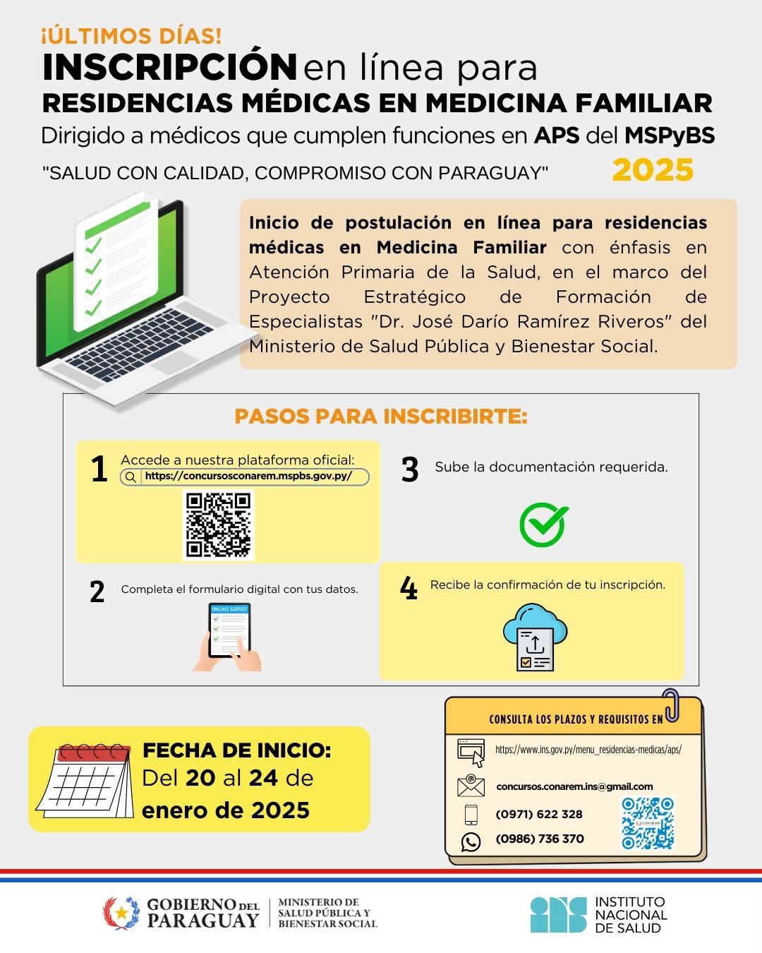 El Ministerio de Salud Pública y Bienestar Social, invita a los médicos interesados a postularse para las Residencias Médicas de la especialidad en Medicina Familiar, en el marco del Proyecto Estratégico de Formación de Médicos Especialistas «Dr. José Darío Ramírez Riveros».